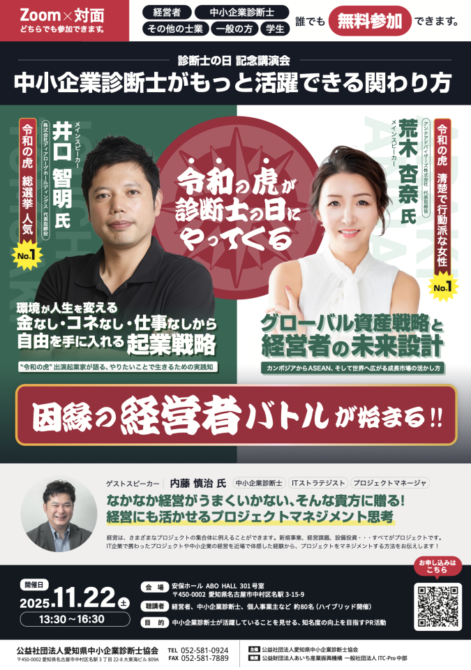 本年度の「中小企業診断士の日 記念講演会」では、YouTube配信のリアリティ番組「令和の虎」でおなじみの 井口智明氏 と 荒木杏奈氏 をメインスピーカーにお迎えし、それぞれのご経験に基づいた挑戦と戦略について対談していただきます。さらに、ゲストスピーカーとして中小企業診断士の 内藤慎治氏 にご登壇いただき、実務に活かせるプロジェクトマネジメント思考についてご講演いただきます。